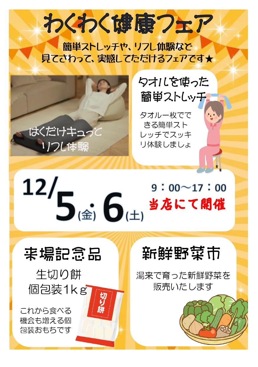 | 2025/11/27 こんにちは!むらおです 体調を崩しやすい季節、お元気ですか?寒くなると身体を動かす機会も減ってしまいますよね。 な・の・で!一緒にタオルストレッチ、しませんか?タオルを使って5〜10分程度座ったままできる上半身のストレッチをレクチャーします♪ もちろん、無理なく楽しく!を第一にわくわくした時間を過ごしましょう。 いつもの新鮮野菜市も同時開催します。 ぜひお待ちしております。 |