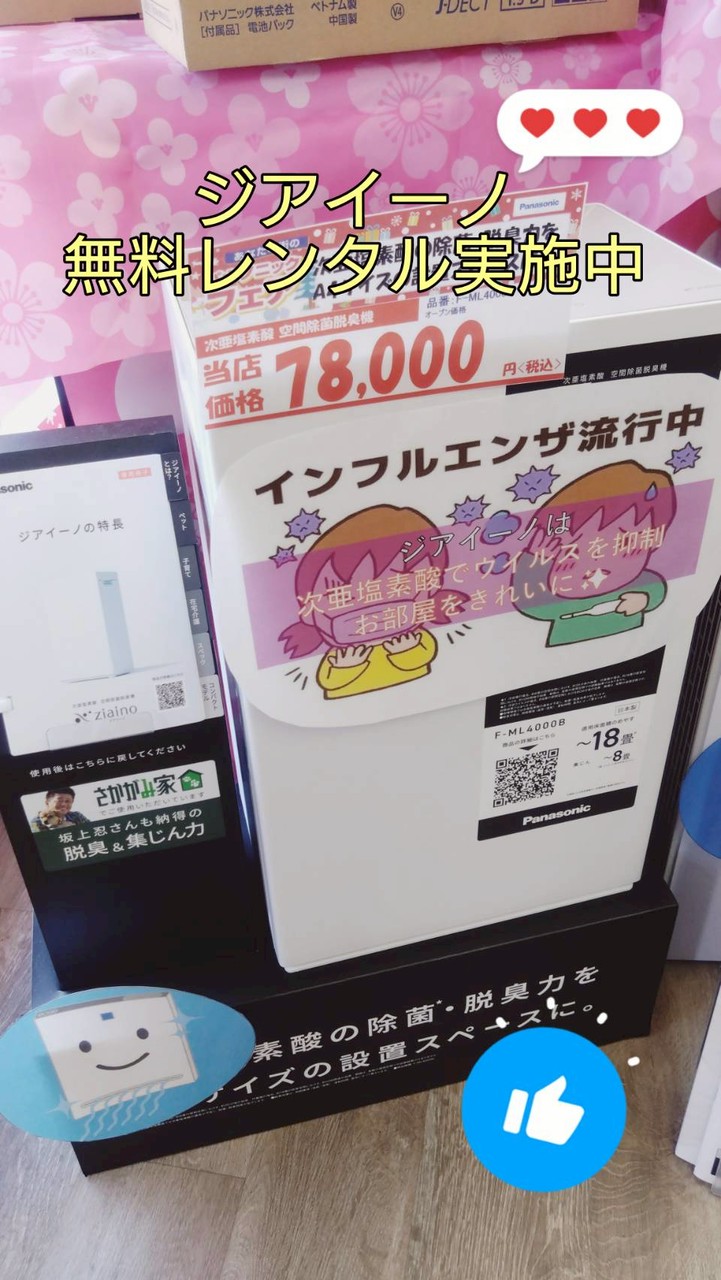 | 2026/01/29 うがい・手洗い・ジアイーノ こんにちは!むらおです インフルエンザBがちょっとずつ流行ってきているそうです うがい・手洗い・ジアイーノ ジアイーノは、次亜塩素酸で空気を洗う優れもの! 除菌・脱臭・ウイルスやカビ抑制・集塵機能あり ご自分の生活環境で、実際に使っていただき効果をお試しください チャットにてお気軽にお問合せください |