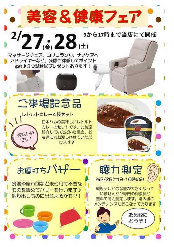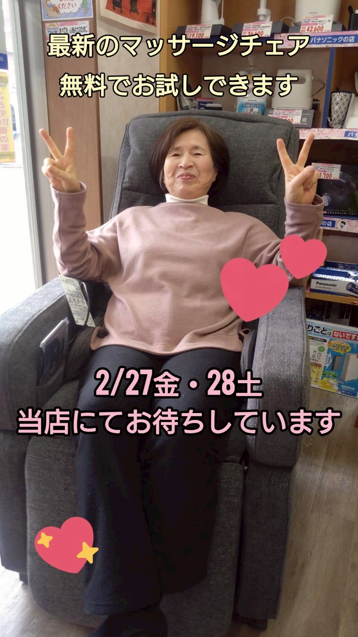 | 2026/02/25 ★美容&健康フェア★ 最新のマッサージチェアやドライヤーなどを体感できる! 美容と健康に関する家電製品を集めてご紹介するイベントのご案内です 2/27(金)・28(土)当店にて開催! スタンプラリー集めたらプチギフトもあります♪ぜひお友達と一緒に遊びに来てください 開催期間:2026.02.27〜2026.02.28 |